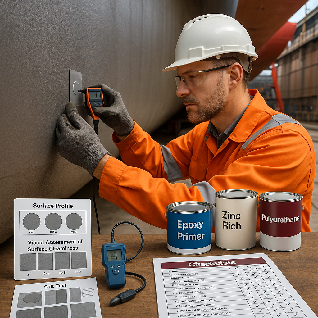- ตรวจวัดค่าความเค็ม (soluble salt) ด้วยวิธี ISO 8502-9 ค่าต้องไม่เกินมาตรฐานเพื่อลดปัญหา blistering หรือสนิมทะเล