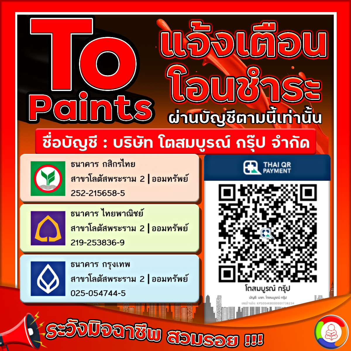 ขณะนี้ มีมิจฉาชีพแอบอ้างชื่อ บริษัทโตสมบูรณ์กรุ๊ป จำกัด โดยใช้ชื่อและที่อยู่บริษัทไปทำการขอใบเสนอราคาเพื่อ ซื้อ/ขาย สินค้า และโอนเงินเข้าบัญชีธนาคารอื่น ซึ่งไม่ใช่บัญชีธนาคารของบริษัท